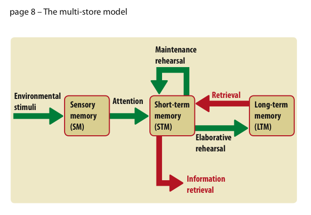 - This is not one single theory but a generic term used to describe all the perspectives that focus how our cognitive processes such as attention, perception, encoding, storage, and retrieval of knowledge. It uses a two store model where stimuli enter the Sensory Register and from there go to Short Term Memory. Here through rehearsal and encoding they can get stored in Long Term memory. The retrieval process can access this information from LTM and bring it to the Working Memory for use. The model is much like that of a computer.